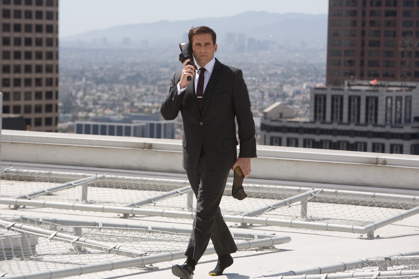 Agent 99 (Anne Hathaway) and Maxwell Smart (Steve Carell) runningMaxwell Smart talking on his show phone