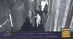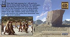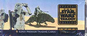 | |  Join Topps in celebrating the 20th anniversary of Star Wars with this special edition widevision set. This 72 card series features double UV-coating and foil stamping. 60 cards are devoted to the ALL-NEW special effects and footage from Star Wars: A New Hope, 6 cards to The Empire Stricks Back and 6 to Return of the Jedi. Card backs will have behind-the-scenes photos, illustrations, storyboards, and text diving into the pool of Star Wars inside info.