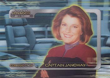 | |  Relive the adventures of the past three years with the crew of the Starship Voyager as they make their way… Closer To Home. 90 episode cards form a synopsis of seasons 3, 4 and 5. The 9-card subset, Janeway's Adversaries features 9 of Janeway's arch-enemies who have taken on the captain in a battle of wits, cunning and guts. Insert Cards| Qty | Name | Odds |