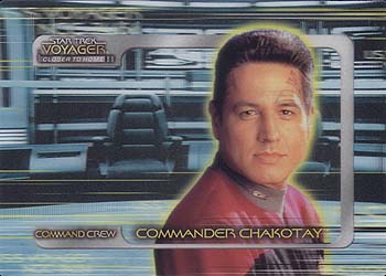 | 9 | Command Crew 9 personnel profiles of the crew using 3-D lenticular technology. Only 750 Made | | | 9 | Advanced Technology 9 foil stamped cards describing the latest technological advances accumulated on their journey to get back home | 1:4 | | 9 | Adventures of Captain Proton 9 holo-foil stamped cards highlighting the new and exciting "Captain Proton" holo-novel frequented by Harry Kim and Tom Paris | 1:8 | | 9 | Interstellar Species 9 "glow-edge" plastic cards highlighting alien encounters with the voyager crew written from Seven of Nine's point of view. | 1:12 | | | Autograph Hand-signed autographs from the main cast and special guest stars | 1:54 |