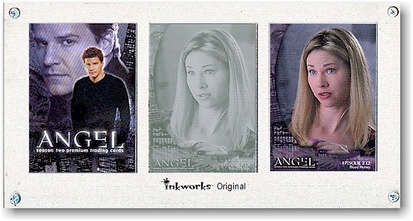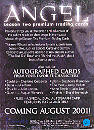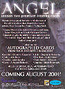 | |  The Angel: Season Two base set of 90 all-new cards includes the always popular Episode Cards and “Demon Compendium” plus new subsets “The Bad Ol’ Days” and “Behind the Music.” In addition to the base set, several levels of bonus cards will be made available including a City of Angel Foil Puzzle, L.A. Women Cards, an Angel Heart Card and four different limited edition box loader cards. Autographed cards include Charisma Carpenter (Cordelia) and a special dual autograph card signed by Julie Benz (Darla) and Juliet Landau (Drusilla) as well as seven other cards personally signed by stars of the show. Insert Cards| Qty | Name | Odds |