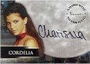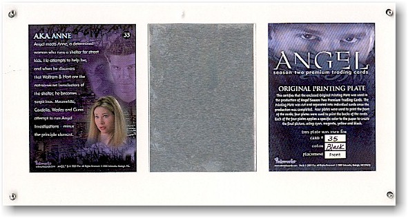 | | Printing Plate Original printing plate in one of four colors (cyan, magenta, yellow, black) | | | 4 | Promo | | | 9 | City of Angel Foil puzzle featuring Angel, Cordelia, Wesley, and Gunn | 1:11 | | 6 | L.A. Women The good and the bad women of Angel: Kate, Lilah, Cordy, Birginia, Darla, and Drusilla | 1:17 | | 9 | Autograph Cordelia, Darla, Drusilla, Gunn, Lilah, The Host, Anne Steele, Virginia, plus a special dual autograph featuring Darla and Dru | 1:45 | | 1 | Angel Heart The redemption of Angel | 1:107 | | 4 | Box Loader | 1:box | | 1 | Case Loader | 1:case |