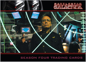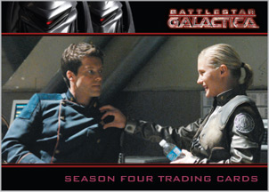 | |  Relive the action, the drama, the struggles and the victories of the final season with Rittenhouse Archive's Battlestar Galactica Season Four trading cards. Each box will contain TWO autograph cards and TWO relic cards as well as at least one 63-card set covering all 20 episodes from the fourth season.