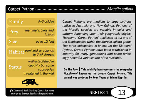 | |  This set is the first release from Diamondback Trading Cards and the base set for all future 'Reptiles' releases. It contains 50 unique cards depicting Snakes, Lizards and Turtles/Tortoises from around the world.