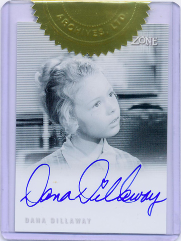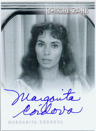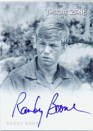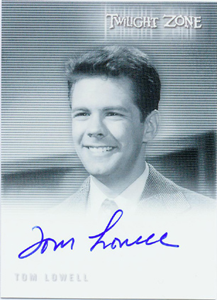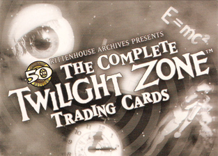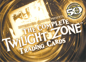 The case topper is a Dana Dillaway (from "One For The Angels") autograph card. Originally, the case topper was set to be a sequentially numbered Rod Serling facsimile autograph card. For every 3 cases purchased customers receive a Cliff Robertson (A Hundred Yards Over The Rim) autograph card variation. Customers pre-ordering 6 cases will receive a free George Clayton Johnson autograph card. Johnson wrote several Twilight Zone episodes. For every 12 cases purchased customers receive a "The Complete Twilight Zone" Archive Box, including a complete set of all pack-inserted autograph cards! Insert Cards| Qty | Name | Odds |